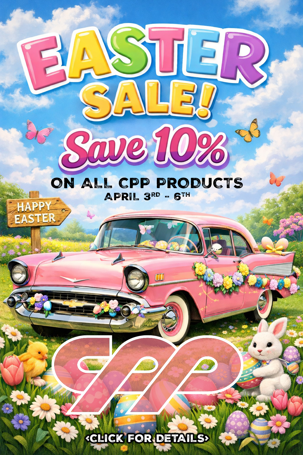 10% off all orders with a merchandise order total of $399 or more. Offer valid on all CPP Products only. $399 or more order total qualification excludes any non CPP Products, sales tax and shipping costs. Promotion cannot be combined with additional discount or gift certificates. Offer valid for orders placed over the phone or online. Must enter or mention Promo Code: EASTER26
